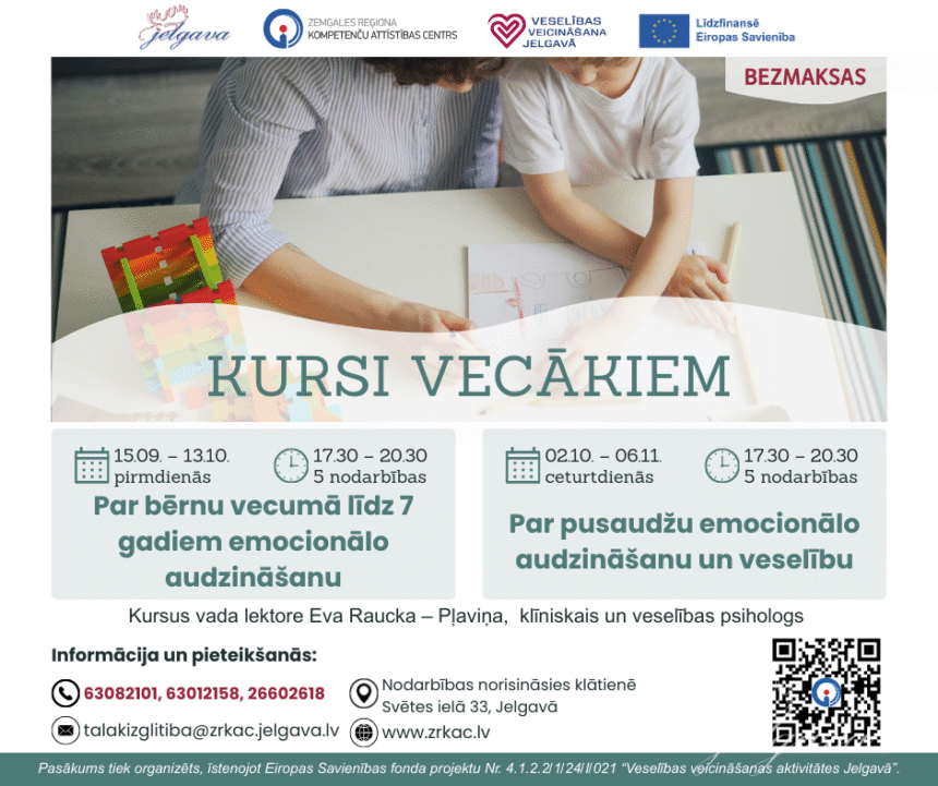 Zemgales reģiona Kompetenču attīstības centrs (ZRKAC) aicina vecākus piedalīties bezmaksas kursos par bērnu un pusaudžu emocionālo audzināšanu un veselību. Nodarbības norisināsies klātienē ZRKAC, Svētes ielā 33, un tās vadīs klīniskā psiholoģe Eva Raucka-Pļaviņa.