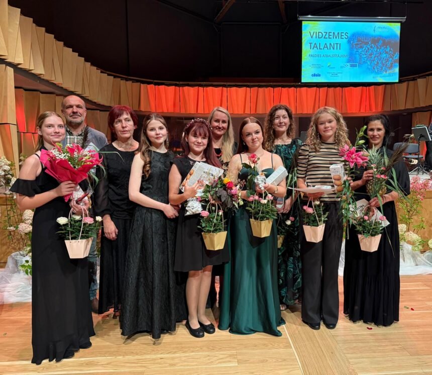 Foto – pirmā rinda no kreisās: Vidzemes talanti – Nikola Anna Eiduka, Paula Bendika, Dārta Kalniņa, Rūta Saulīte, Asnāte Krūmiņa. Otrā rinda – pedagogi Jānis Jansons, Maija Ozola, Ieva Veide, Anna Berklāva, Irina Vācmane