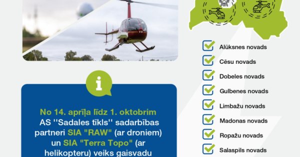 Informējam, ka nelabvēlīgo laikapstākļu dēļ vairākos Latvijas novados pagarināta AS “Sadales tīkls” elektrolīniju apsekošana ar droniem un helikopteru. Gaisvadu elektrolīniju apsekošana tiks veikta līdz 1. oktobrim.