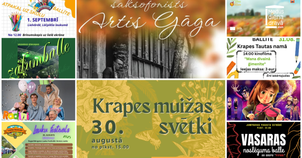 Krapes muižas svētki – jau no plkst. 15.00 būs iespēja doties aizraujošās ekskursijās pa muižas ansambļa mājām, kurās notiek foreļu un Āfrikas samu audzēšana, sidra un vīna raudzēšana, aveņu audzēšana, kā arī tradicionālās tautas mūzikas instrumentu ekspozīcija muižas pārvaldnieka namā – “Skaņumājā”. Kad ekskursiju loks būs noslēdzies, interesenti laipni aicināti uzkavēties ilgāk – no plkst. 18.00 sāksies kultūras programma “Skaņumājas” zaļajā skatuvē. Ieeja pasākumā bez maksas, taču ziedojumi kopienas attīstībai virs 5 EUR piedalās Laimes spēlē. Vairāk informācijas ŠEIT