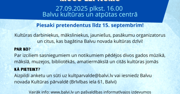 Balvu novada Kultūras pārvalde aicina līdz 2025. gada 15. septembrim izvirzīt pretendentus Gada balvai kultūrā ”Mūsu lepnums” – Balvu novada pašvaldības apbalvojumam par īpašiem nopelniem un nozīmīgu ieguldījumu novada kultūrvides veidošanā un uzturēšanā. Pretendentus deviņās nominācijās var pieteikt gan iedzīvotāji, gan juridiskas personas.