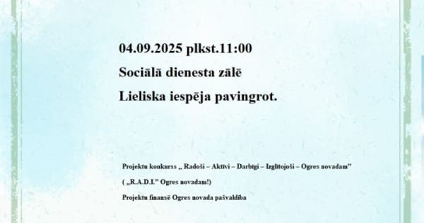 „Dejas sēdus” nodarbība notiks 4. septembrī plkst. 11.00 Sociālā dienesta zālē. Būs lieliska iespēja pavingrot. Laipni lūgti!