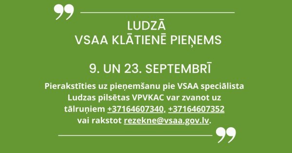 2025. gada septembrī VSAA speciālists Ludzas pilsētas VPVKAC telpās pieņems klientus pēc iepriekšēja pieraksta – 9. septembrī un 23. septembrī.