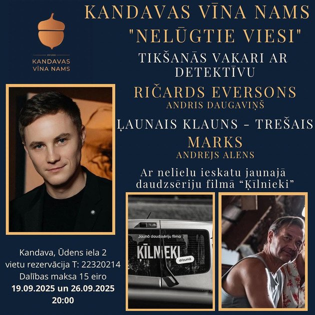 19. septembrī 2025. gadā un 26. septembrī 2025. gadā plkst. 20.00 Kandavas Vīna namā viesosies mūsu iemīļotā seriāla “Nelūgtie viesi” aktieri: