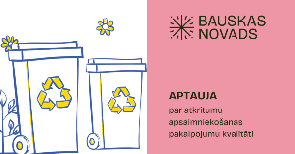 Līdz 29.septembrim norisinās aptauja par atkritumu apsaimniekošanu Bauskas novadā, informē SIA ”Bauskas novada komunālserviss”. Aptaujas mērķis ir noskaidrot viedokļus par pakalpojumu kvalitāti, sadzīves atkritumu šķirošanas paradumiem, pieejamo infrastruktūru, kā arī izpratni un attieksmi pret aprites ekonomikas principiem pašvaldībā.
