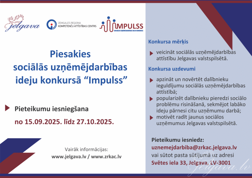 Jau trešo gadu Jelgavas pašvaldība rīko sociālās uzņēmējdarbības ideju konkursu “Impulss”. Sociālās uzņēmējdarbības idejas konkursam var pieteikt no 15. septembra līdz 27. oktobrim. Konkursa mērķis ir motivēt uzņēmējus pievērsties sabiedrībai nozīmīgu sociālo problēmu risināšanai un rosināt uzsākt sociālo uzņēmējdarbību pilsētā.