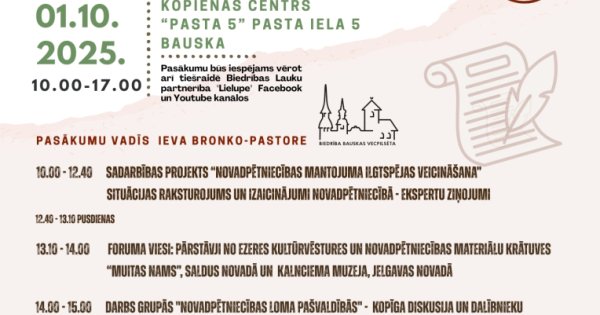 Biedrības “Lauku partnerība Lielupe”, “Bauskas rajona lauku partnerība”, “Dobeles rajona lauku partnerība” un “Partnerība Kaimiņi” aicina piedalīties forumā – diskusijā par novadpētniecības lomu un nozīmi pašvaldībās, kas notiks 2025. gada 1. oktobrī Kopienas centrā “Pasta5”, Bauskā. Pasākumu būs iespējams vērot arī tiešraidē.