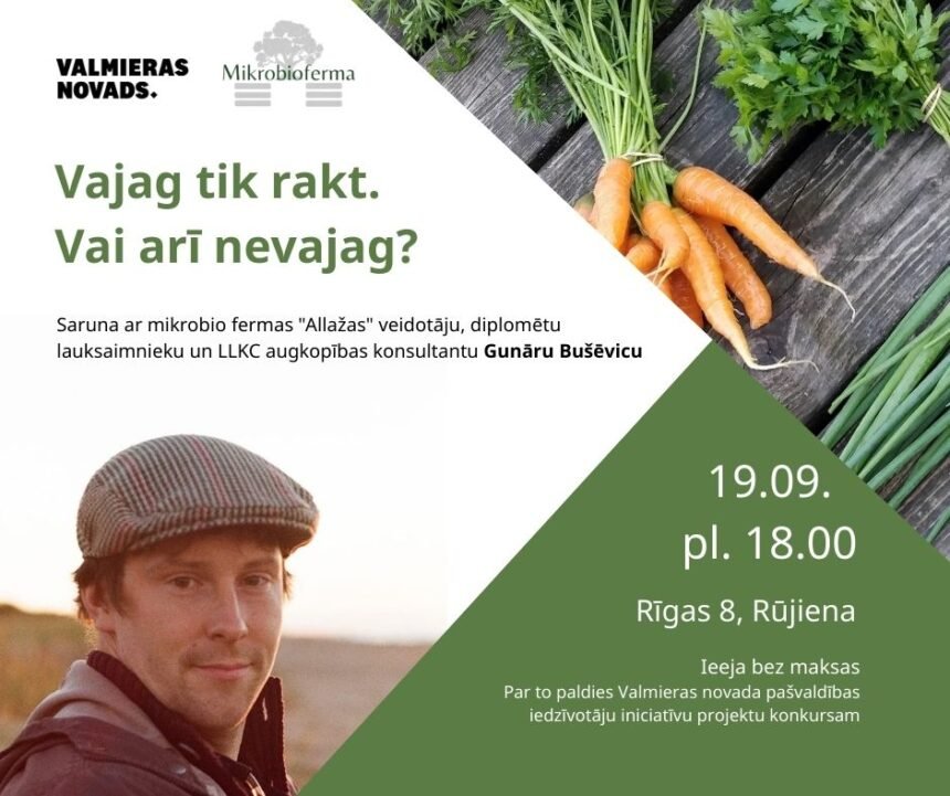 19. septembrī plkst.18.00 Rūjienā, Rīgas ielā 8, notiks sarunu vakars par dārza tēmu. Pasākumā Andis Bošs sarunāsies ar Gunāru Bušēvicu, diplomētu lauksaimnieku, kurš, iegūstot pieredzi un zināšanas Skandināvijas valstīs, atgriezies uz dzīvi Latvijā un savā saimniecībā “Allažas”, Kazdangas pagastā, kopā ar sievu Ellenu izveidojis mikrobio fermu. Gunārs ar Ellenu “Allažās” ar dažādiem permakultūras un atjaunojošās dārzkopības paņēmieniem zem klajas debess un siltumnīcās audzē augstvērtīgus salātus un saknes tirgum un restorāniem.