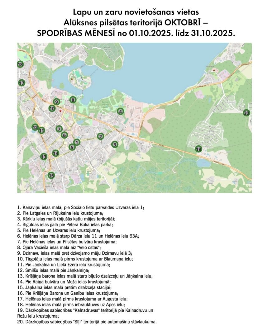 No 1. līdz 31. oktobrim Alūksnes novada pašvaldība Alūksnes iedzīvotājiem piedāvā iespēju lapas, zarus un citus dārza atkritumus novietot speciāli šim mērķim noteiktos punktos pilsētā, no kurienes tos pašvaldības iestāde “Spodra” nogādās uz zaļo un dārza atkritumu kompostēšanas laukumu Alsviķu pagasta “Iztekās”.