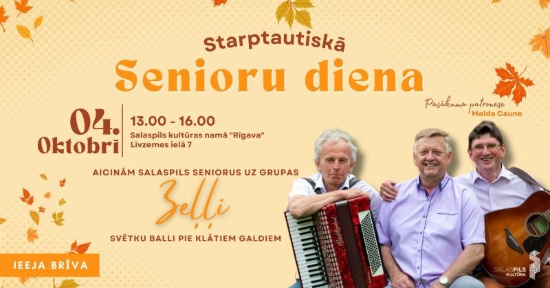 4. oktobrī no plkst. 13.00 līdz 16.00 Salaspils kultūras namā tiks svinēta Starptautiskā senioru diena. Galvenais svētku notikums būs balle, kurā uzstāsies iemīļotā grupa “Zeļļi”.