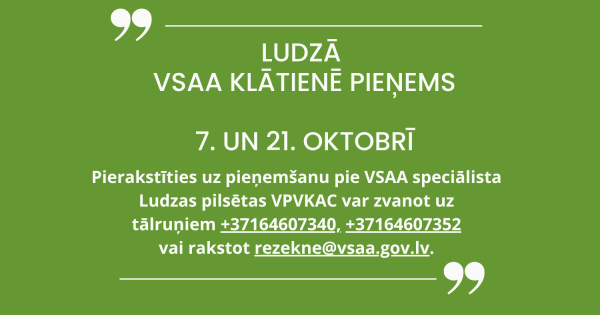 2025. gada oktobrī VSAA speciālists Ludzas pilsētas VPVKAC telpās pieņems klientus pēc iepriekšēja pieraksta –  7. oktobrī un 21. oktobrī.