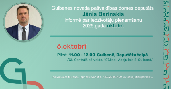 Gulbenes novada pašvaldības domes deputāts Jānis Barinskis informē par iedzīvotāju pieņemšanu 2025.gada oktobrī.