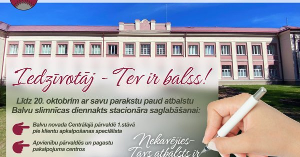 Iedzīvotāji aicināti izteikt savu atbalstu un parakstīties – Balvu novada Centrālajā pārvaldē (1. stāvā pie klientu apkalpošanas speciālista), apvienību pārvaldēs un pagasta pakalpojumu centros, Balvu Centrālajā bibliotēkā un tās struktūrvienībās. Katrs paraksts palīdzēs nodrošināt, ka mūsu novada iedzīvotājiem arī turpmāk būs pieejama kvalitatīva medicīniskā aprūpe tepat tuvumā.