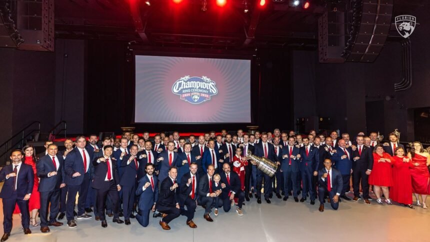 Uvis Jānis Balinskis, kurš pārstāv Floridas “Panthers”, sezonas atklāšanas spēlē nepiedalījās, paliekot komandas rezervē, kamēr čempionvienība mājās ar 3:2 pārspēja Čikāgas “Blackhawks”. Pirms mača “Panthers” arēnā tika pacelts čempionu baneris, atzīmējot komandas otro Stenlija kausu pēc kārtas un trešo finālu trīs sezonu laikā.