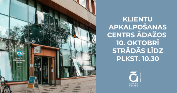 Valsts un pašvaldības vienotais klientu apkalpošanas centrs Ādažos, darbinieku apmācību dēļ, šā gada 10. oktobrī strādās līdz plkst. 10.30.