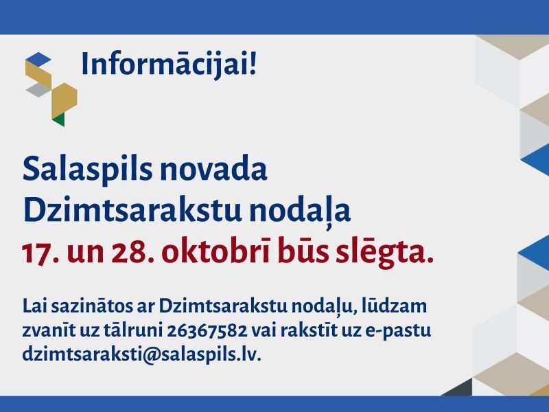 Salaspils novada Dzimtsarakstu nodaļa 17. un 28. oktobrī būs slēgta