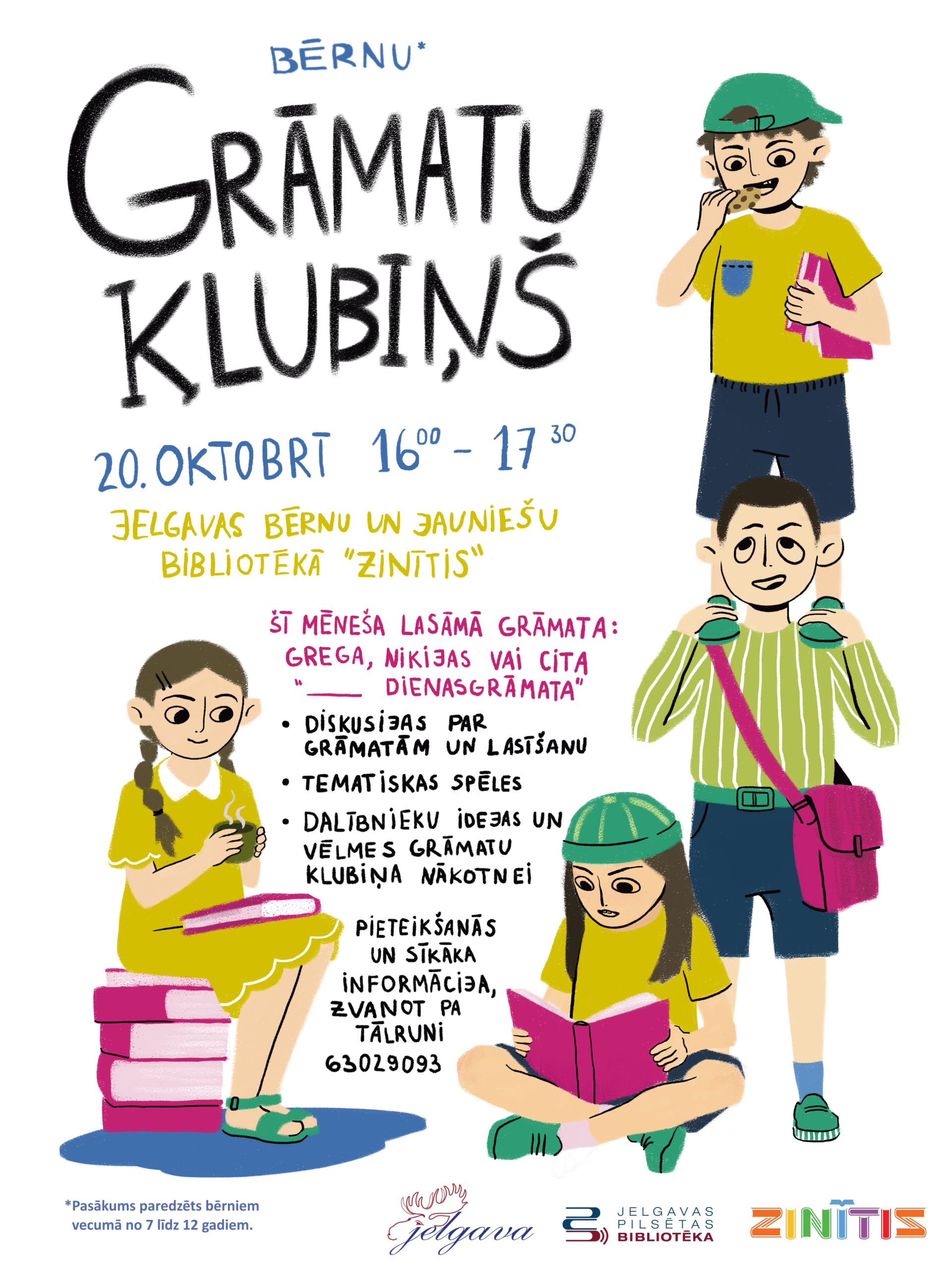 Nākamā bērnu lasītāju klubiņa tikšanās notiks 20. oktobrī no pulksten 16 līdz 17.30. Šī mēneša lasāmā grāmata ir Grega, Nikijas vai cita dienasgrāmata.