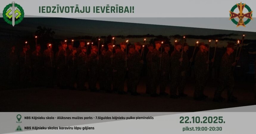 Turpinot atjaunoto tradīciju, 22. oktobrī plkst. 19.00-20.30 notiks Nacionālo bruņoto spēku Kājnieku skolas karavīru lāpu gājiens. Maršruts: Kājnieku skola (Lāčplēša iela 1 – Vējakalna iela līdz Siguldas ielai, pa labi uz parku – Fitinghofu ielu līdz Kolberģa ielai uz 7. Siguldas kājnieku pulka pieminekli).