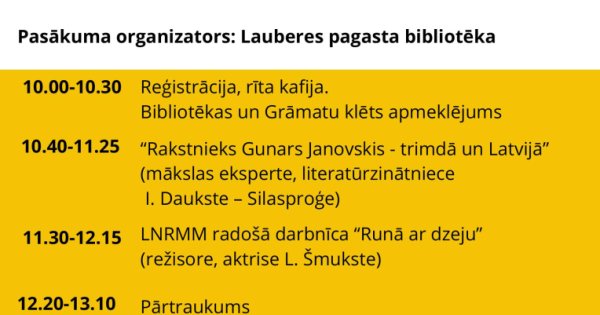 - 10.40–11.25 – “Rakstnieks Gunars Janovskis – trimdā un Latvijā” (mākslas eksperte, literatūrzinātniece Inguna Daukste–Silasproģe)