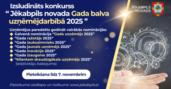 Lai godinātu uzņēmēju darbu un popularizētu to devumu novadam, Jēkabpils novada pašvaldība izsludina konkursu “Jēkabpils novada Gada balva uzņēmējdarbībā 2025”.