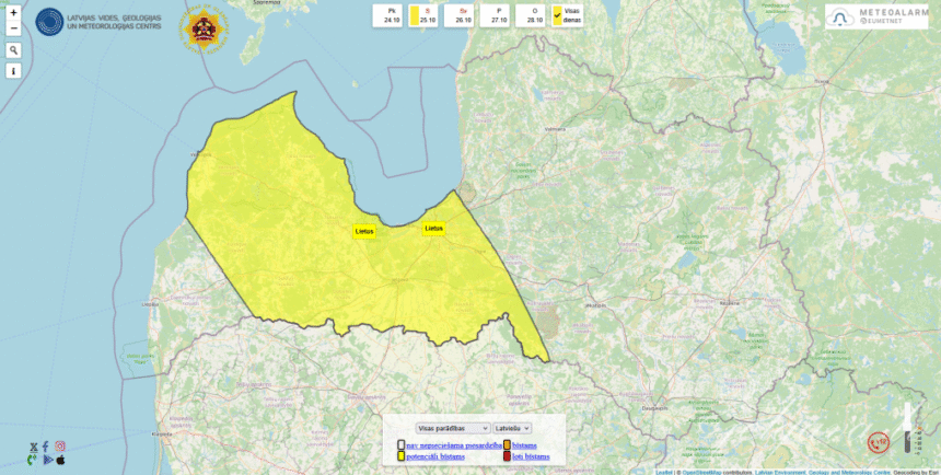 Meteorologi informē, ka naktī uz 25. oktobri Latvijas teritoriju no dienvidiem sāks šķērsot nokrišņu zona – visā valsts teritorijā gaidāms lietus, bet no rīta un dienā rietumu un centrālajos rajonos gaidāms stiprs ilgstošs lietus. Nokrišņu daudzums sasniegs 20–24 milimetrus uz kvadrātmetru. Latvijas Vides ģeoloģijas un meteoroloģijas centrs izsludinājis dzelteno lietus brīdinājumu.