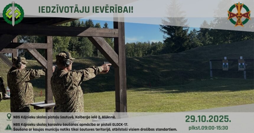 NBS Kājnieku skolu informē, ka 29. oktobrī no plkst. 9.00 līdz plkst. 15.30 NBS Kājnieku skolas pistoļu šautuvē Kolberģa ielā 2, Alūksnē, NBS Kājnieku skolas personālam notiks šaušanas apmācība ar pistoli GLOCK-17, šaušana ar kaujas munīciju notiks tikai šautuves teritorijā un atbilstoši visiem drošības standartiem.