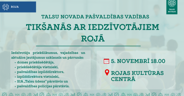 Iedzīvotāji aicināti uz tikšanos ar Talsu novada pašvaldības domes vadību 5. novembrī plkst. 18.00 Rojas kultūras centrā.
