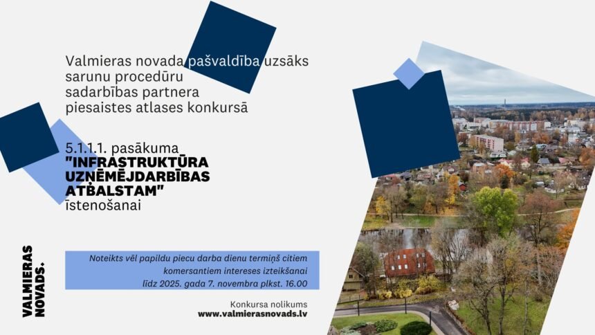 Konkursa nolikums paredz, ka pirms sarunu procedūras uzsākšanas, jānosaka vēl papildu piecu darba dienu termiņu citiem komersantiem intereses izteikšanai. Attiecīgi aicinām komersantu, kurš vēlas kļūt par sadarbības partneri, līdz 2025. gada 7. novembra plkst. 16.00 iesniegt Valmieras novada pašvaldībai atbilstoši konkursa nolikumam sagatavotu piedāvājumu, kā arī citu informāciju, ko pretendents uzskata par nepieciešamu sniegt pašvaldībai lēmuma pieņemšanai. Pieteikums jāsagatavo elektroniski un jānosūta uz e-pasta adresi: .