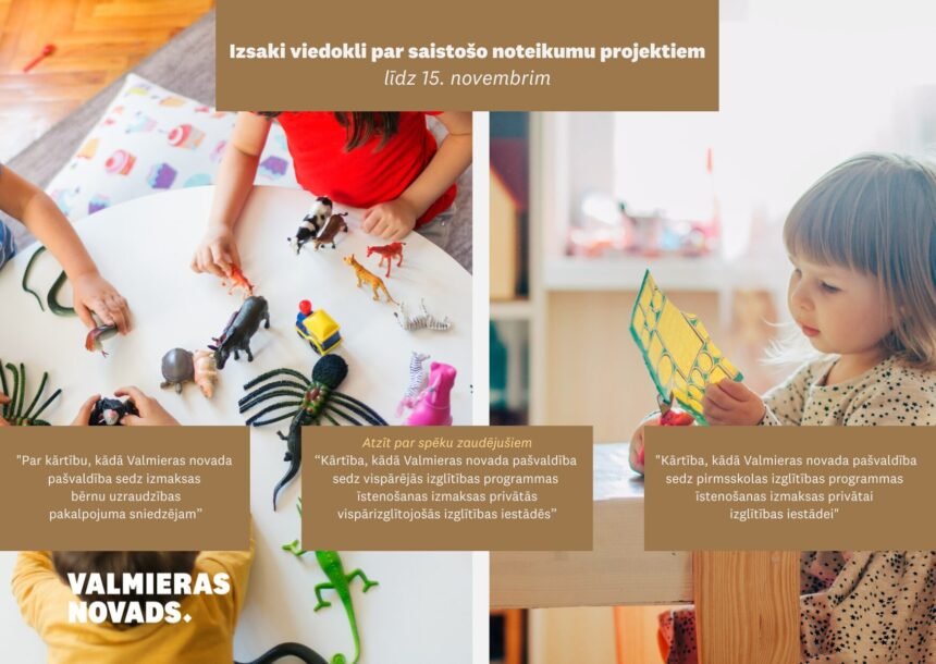 Valmieras novada pašvaldība aicina izteikt viedokli par saistošo noteikumu “Kārtība, kādā Valmieras novada pašvaldība sedz pirmsskolas izglītības programmas īstenošanas izmaksas privātai izglītības iestādei” projektu un grozījumiem saistošajos noteikumos “Par kārtību, kādā Valmieras novada pašvaldība sedz izmaksas bērnu uzraudzības pakalpojuma sniedzējam”, kā arī par saistošo noteikumu “Kārtība, kādā Valmieras novada pašvaldība sedz vispārējās izglītības programmas īstenošanas izmaksas privātās vispārizglītojošās izglītības iestādēs” atzīšanu par spēku zaudējušiem.