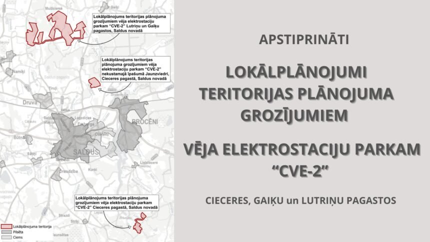 - “Par “Lokālplānojuma teritorijas plānojuma grozījumiem vēja elektrostaciju parkam “CVE-2” Jaunzviedri, Cieceres pagastā, Saldus novadā” apstiprināšanu un saistošo noteikumu izdošanu” (protokols nr.15.,2.§); vairāk ŠEIT.