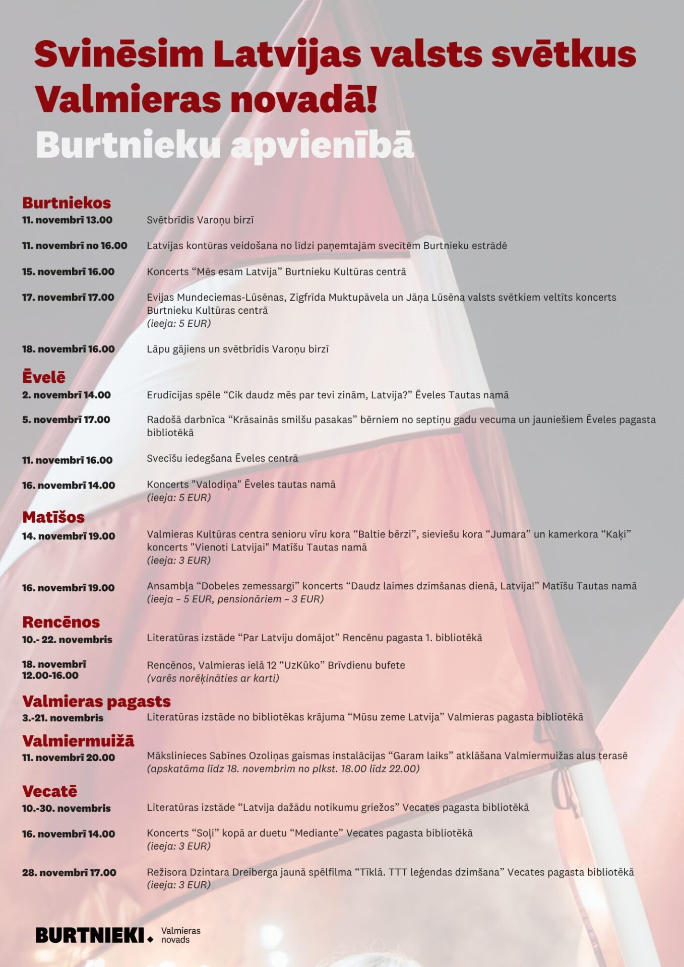 15.novembrī plkst. 16.00 Burtnieku Kultūras centrā notiks koncerts “Mēs esam Latvija”. Piedalīsies: saksofonu ansamblis “Valmieras meitenes”, vadītāja Agnese Geduševa-Jefimova, Valmieras Pārgaujas Valsts ģimnāzijas TDK “Pārgaujas delveri”, vadītājs Edgars Bauers, Valmieras Valsts ģimnāzijas JDK “Pērkons”, vadītāji Ingrīda Upīte un Jānis Psjuks, Burtnieku Kultūras centra pirmsskolas vecuma bērnu deju kolektīvs “Ķipari”, vadītāja Vēsma Felkere, un Burtnieku Kultūras centra sieviešu vokālais ansamblis “Pieskāriens”, vadītāja Laura Riekstiņa.