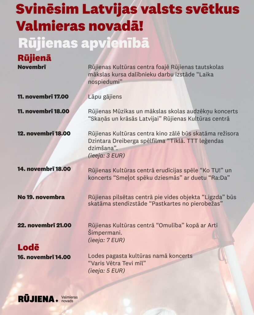 11.novembrī aicinām būt kopā Rūjienā. Plkst. 17.00 no Rūjienas vidusskolas (Rīgas iela 30) līdz Ternejas parkam un Centra laukumam norisināsies Lāpu gājiens. Pēc tā svinīgs brīdis ar karoga masta atklāšanu un Latvijas karoga uzvilkšanu pie Represēto piemiņas akmens Ternejas parkā, piemiņas brīdis būs arī pie pieminekļa “Tālavas taurētājs”. Plkst. 18.00 Rūjienas Kultūras centrā norisināsies Rūjienas Mūzikas un mākslas skolas audzēkņu koncerts “Skaņās un krāsās Latvijai”.