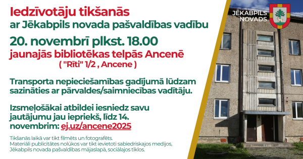 Informējam, ka tikšanās laikā var tikt filmēts un fotografēts. Materiāli publicitātes nolūkos var tikt ievietoti sabiedriskajos medijos, Jēkabpils novada pašvaldības mājaslapā, sociālajos tīklos.