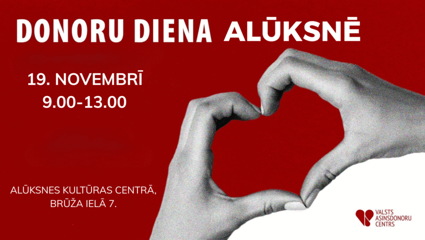 Valsts asinsdonoru centrs rīko donoru dienu Alūksnes Kultūras centrā, Brūža ielā 7, Alūksnē.