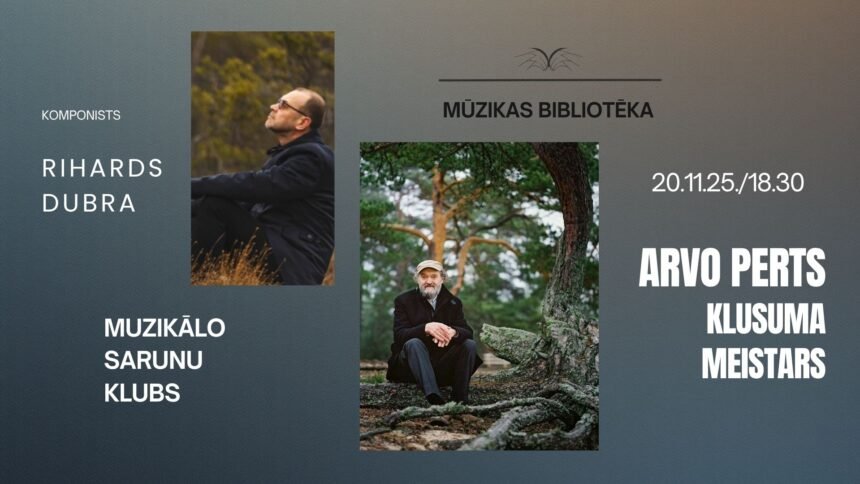 Ceturtdien, 20. novembrī, plkst. 18.30 Mūzikas bibliotēkā notiks muzikālo sarunu kluba tikšanās, kuras viesis būs komponists Rihards Dubra. Šīs reizes tēma – “Arvo Perts – klusuma meistars”, veltīta izcilajam igauņu komponistam Arvo Pērtam, kurš šogad svin savu 90. dzimšanas dienu.