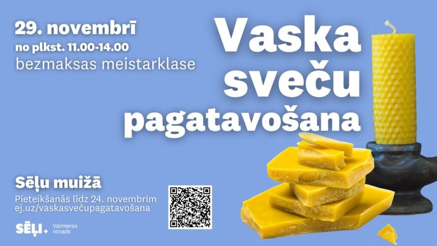 Valmieras novada pašvaldība aicina interesentus pieteikties dalībai pieaugušo izglītības bezmaksas meistarklasei “Vaska sveču pagatavošana”, kas notiks sestdien, 29. novembrī, no plkst. 11.00 līdz 14.00 Sēļu muižā, Sēļos. Meistarklasi vadīs Dace Stepanova.