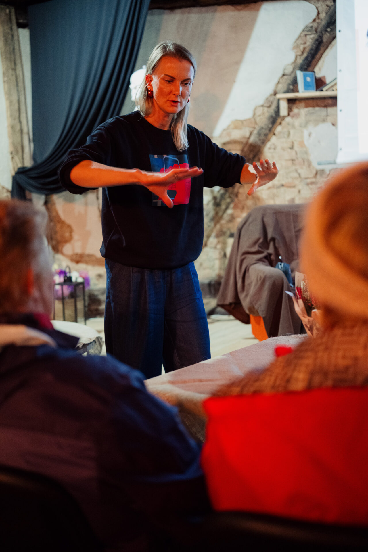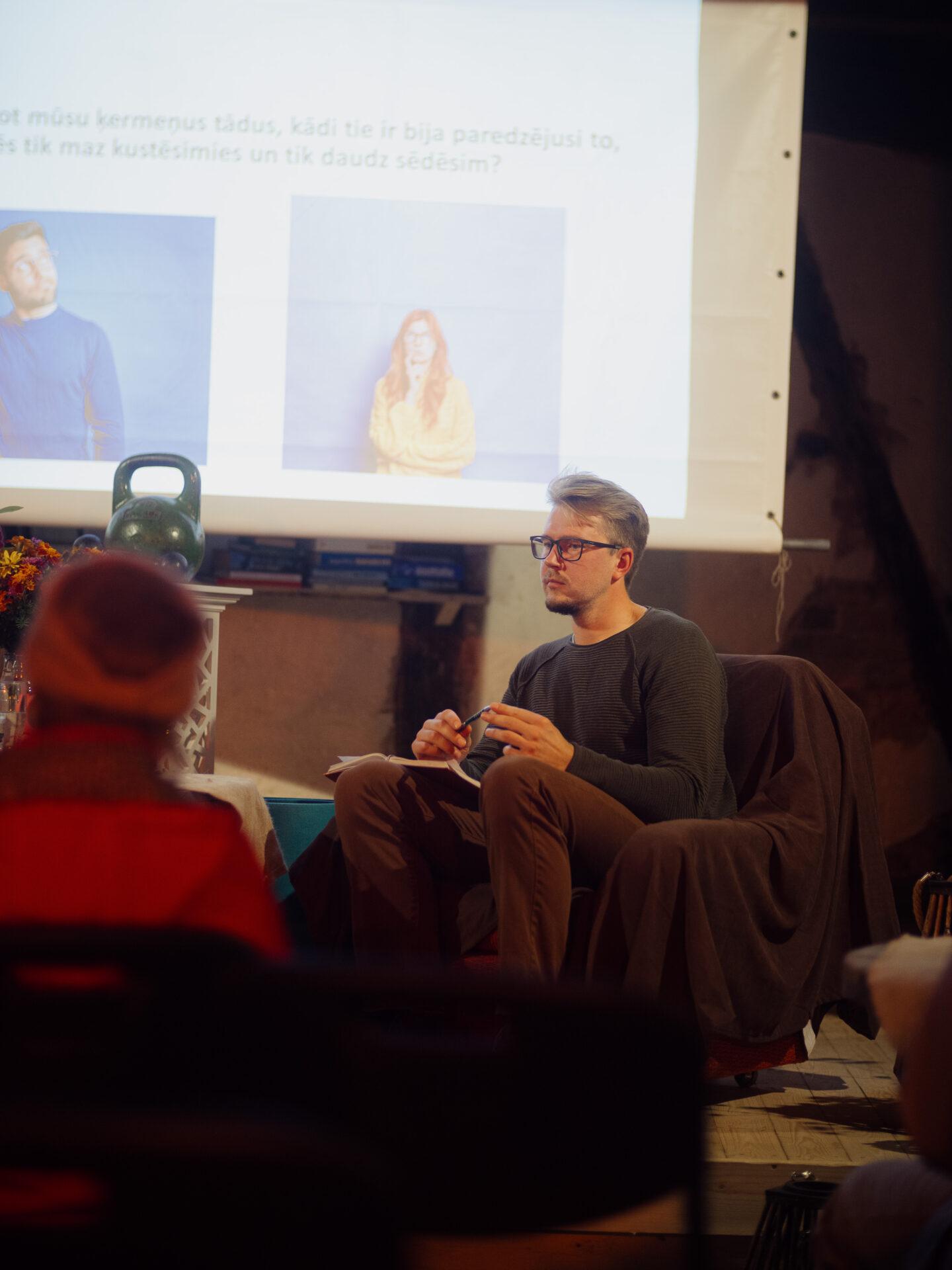 26. septembrī Rūjienā, Rīgas ielā 8, plkst. 18.00 aizvadīts otrs projekta pasākums – sarunu vakars par muguras veselību un labsajūtu ar sertificētu fizioterapeiti, sporta zinātnes doktori, anatomijas docenti un Vingrosev.lv fizioterapijas studijas vadītāju Ievu Zvīguli. Sarunu vadīja Andis Bošs, taču bija prieks dzirdēt arī skatītāju jautājumus. Lai vingrošanu vieglāk ieviest ikdienā, pasākuma noslēgumā kopā ar skatītājiem izveidojām fizisko aktivitāšu pieejamības “karti” tuvējā apkaimē, un uzzinājām gan par treniņiem Rūjienas sporta hallē, gan Mazsalacā, gan par trenažieru zāles pieejamību Rūjienā un Naukšēnos. Salīdzinājumam Ieva padalījās, cik sporta zāles abonaments un treniņi izmaksā Rīgā, un visi klātesošie varēja secināt, ka Rūjienā un Naukšēnos sportošanas iespējas ir nesalīdzināmi draudzīgākā cenā un dažviet pat bez maksas. Lai pasākuma saturs sasniegtu plašāku loku, laikrakstā “Liesma” publicēts pasākuma atskata raksts ar galvenajām atziņām. (Gatavot ēst uz pirkstgaliem un tīrīt zobus, stāvot uz vienas kājas, – Rūjienā aizvadīts sarunu vakars par fiziskajām aktivitātēm un veselību | eLiesma) Pilna atskata galerija pieejama ŠEIT.
