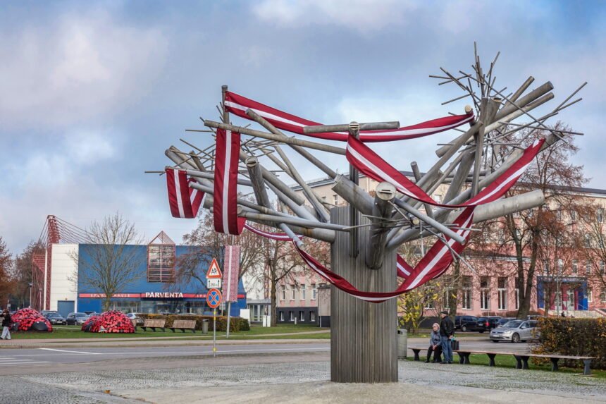 Jelgavā 100 metrus augstajā telekomunikāciju tornī pacelts valsts karogs