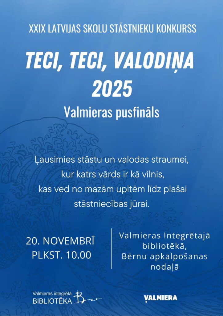 XIII Latvijas Skolu jaunatnes dziesmu un deju svētki ir veiksmīgi aizvadīti, un bērni turpina savas radošās gaitas. Jau 20. novembrī no plkst. 10.00 Valmieras Integrētās bibliotēkas Bērnu apkalpošanas nodaļā norisināsies stāstnieku konkursa “Teci, teci, valodiņa” Valmieras novada pusfināls.