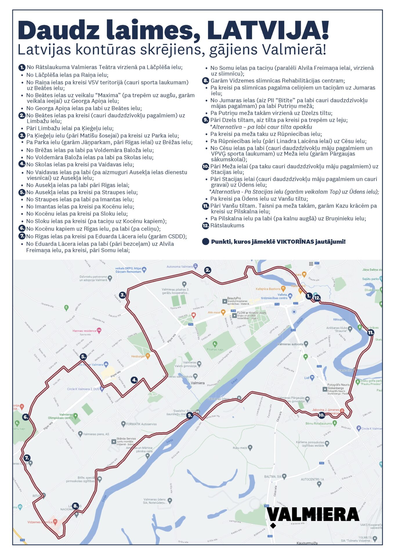 Šogad maršrutā iekļauti 12 punkti ar Latvijas dzimšanas dienai veltītiem viktorīnas jautājumiem. Dalībnieki tos varēs lasīt, noskenējot QR kodu, un atbildes iesūtīt uzreiz – bez nepieciešamības lejupielādēt papildu aplikācijas. Starp pareizo atbilžu iesniedzējiem tiks izlozētas pārsteiguma balvas.
