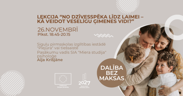 26.novembrī plkst. 18.45-20.15, Siguļu pirmsskolas izglītības iestādē „Piejūra (Skola, Siguļos) notiks lekcija “No dzīvesspēka līdz laimei – kā veidot veselīgu ģimenes vidi?”.