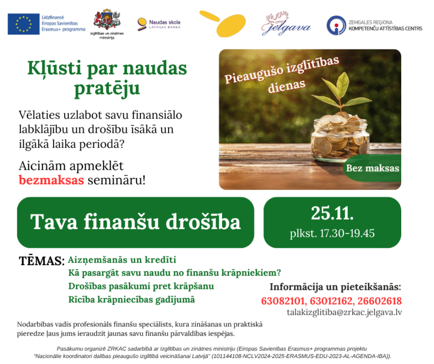 Lai veicinātu sabiedrības finanšu pratību un drošību, Zemgales reģiona Kompetenču attīstības centrā (ZRKAC) 25. novembrī no pulksten 17.30 līdz 19.45 notiks bezmaksas seminārs “Tava finanšu drošība”. Tajā iedzīvotāji aicināti pilnveidot zināšanas par atbildīgu finanšu pārvaldību un drošību digitālajā vidē.