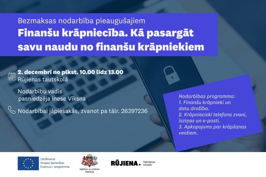 Valmieras novada pašvaldība aicina interesentus pieteikties dalībai pieaugušo izglītības bezmaksas nodarbībai “Finanšu krāpniecība. Kā pasargāt savu naudu no finanšu krāpniekiem”, kas notiks 2025. gada 2. decembrī no plkst. 10.00 līdz plkst.13.00 Rūjienas tautskolā, Skolas ielā 8A, Rūjienā.