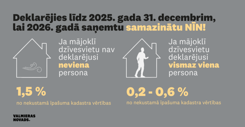 Lai 2026. gadā saņemtu samazinātu NĪN likmi, aicinām Valmieras novada iedzīvotājus deklarēties savos īpašumos līdz šī gada 31. decembrim.