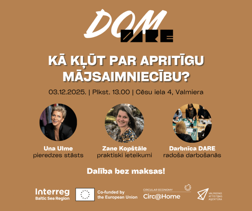 3. decembrī plkst. 13.00, Valmieras koprades darbnīcā DARE (Cēsu iela 4), norisināsies iedvesmas pēcpusdiena – DomDARE “Kā kļūt par apritīgu mājsaimniecību?”. Uz pasākumu tiek aicināts ikviens iedzīvotājs, kuram ir vēlme savu ikdienu padarīt dabai draudzīgāku, un kurš vēlas iegūt jaunas idejas un praktiskus ieteikumus ar ko sākt savu ilgtspējas ceļu!