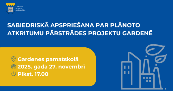 Iedzīvotāji tiek aicināti 27. novembrī plkst. 17.00 Gardenes pamatskolā iepazīties ar plānoto atkritumu (bīstamo un atkritumu, kuri nesatur bīstamas vielas) pārstrādes projekta īstenošanu gazifikācijas iekārtā “Gardenes bīstamo atkritumu novietnē”, uzdot jautājumus projekta izstrādātājiem, saņemt skaidrojumus par ietekmi uz vidi un izteikt savu viedokli pirms lēmuma pieņemšanas.