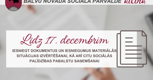 Balvu novada Sociālā pārvalde aicina iedzīvotājus savlaicīgi iesniegt dokumentus materiālās situācijas izvērtēšanai un sociālo pabalstu saņemšanai. Dokumentus jāiesniedz līdz 2025. gada 17. decembrim.