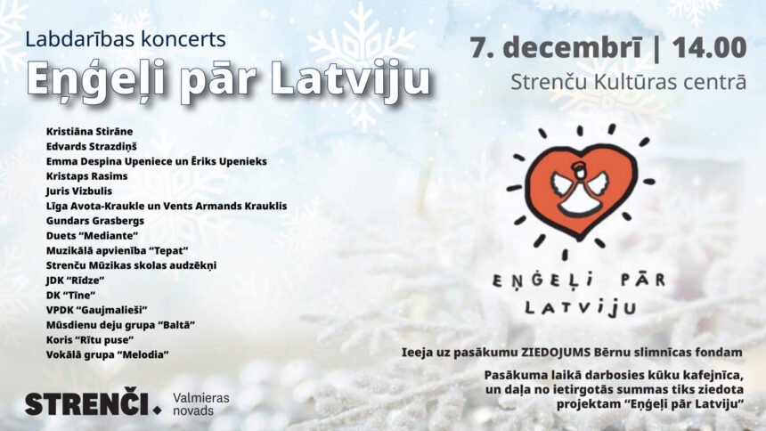 7. decembrī plkst. 14.00 Strenču Kultūras centrā norisināsies labdarības koncerts “Eņģeļi pār Latviju”, kurā ieejas biļete būs ziedojums bērnu sapņu piepildījumam. Koncertā dalību apstiprinājuši Latvijā zināmi mākslinieki: Kristiāna Stirāne, Edvards Strazdiņš, Kristaps Rasims, Gundars Grasbergs, Ēriks Upenieks ar meitu Emmu, Juris Vizbulis, Līga Avota-Kraukle un Vents Armands Krauklis, duets “Mediante”. Koncertā piedalīsies arī muzikālā apvienība “Tepat” un muzikālā apvienība “Melodia”. Ar dejām skatītājus iepriecinās jauniešu deju kopa “Rīdze”, deju kopa “Tīne” un vidējās paaudzes deju kopa “Gaujmalieši”. Laikmetīgo deju koncertā rādīs mūsdienu deju grupa “Baltā”, kora dziesmu kultūru pārstāvēs jauktais koris “Rītu puse”.