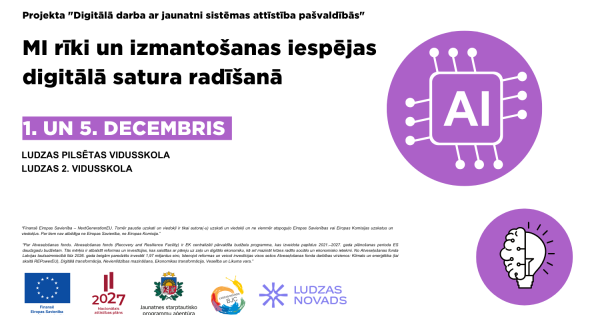 2025. gada 1. un 5. decembrī Ludzas pilsētas vidusskolā un Ludzas 2. vidusskolā projekta “Digitālā darba ar jaunatni sistēmas attīstība pašvaldībās” ietvaros norisināsies projekta pēdējā aktivitāte – izglītojošas nodarbības jauniešiem “MI rīki un izmantošanas iespējas digitālā satura radīšanā”.