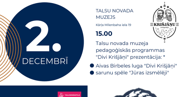 Krišjāņa Valdemāra dzimšanas dienā, 2. decembrī 13.00, Talsu Galvenajā bibliotēkā viesosies Latvijas Nacionālās bibliotēkas galvenā pētniece, Latvijas Bibliotekāru biedrības Grāmatniecības un bibliotēku vēstures sekcijas vadītāja Dr. philol. Jana Dreimane.